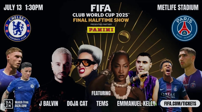 去年7月13日的世俱杯决赛,国际足联临时决定举行史无前例的中场秀表演。格莱美奖得主说唱歌手Doja Cat、尼日利亚歌手Tems、雷鬼天王J Balvin联袂表演,但最低票价并未因新增的中场娱乐秀上涨。国际足联发布的决赛海报,表演嘉宾也占据了C位,将两支参赛队的球星摆在两边。